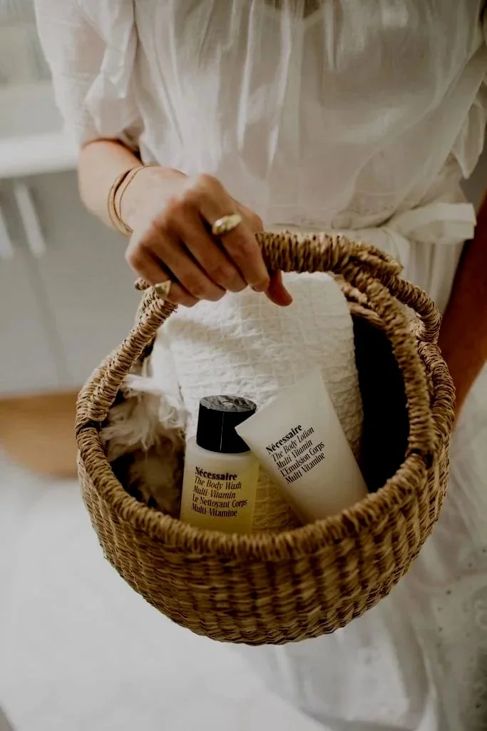 a mom care basket — nourishing body oil, herbal tea, hand cream, lip balm, and a little note from us